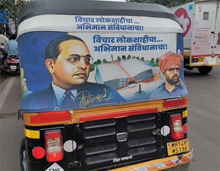 आमदार महेश लांडगे यांनी संविधान भवन निर्माणाची एक जाहिरात केली आहे. या जाहिरातीत महामानव भारतरत्न डॉ. बाबासाहेब आंबेडकर यांचे छायाचित्र आहे. तसेच आमदार महेश लांडगे यांचेही छायाचित्र या जाहिरातीत आहे. विचार लोकशाहीचा..अभिमान संविधानाचा ही टॅगलाईन वापरून केलेल्या या जाहीरातीत डॉ. बाबासाहेब आंबेडकर यांच्या छायाचित्रावर आमदार महेश लांडगे यांची स्वाक्षरी छापण्यात आली आहे. ही जाहिरात शहरातील विविध भागात आणि शेकडो रिक्षांवर करण्यात आली आहे. रिक्षावर करण्यात आलेली ही जाहिरात पाहिल्यानंतर पिंपरी-चिंचवडमधील आंबेडकरी बांधवांमध्ये संतापाची लाट उसळली आहे.