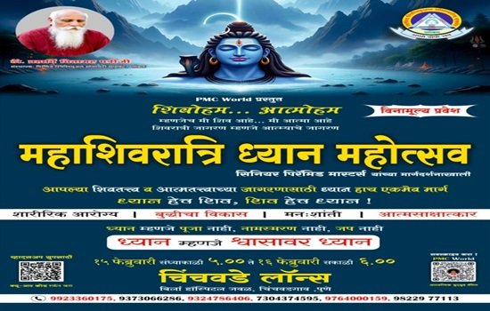 पिंपरी : पीएमसी वर्ल्डच्या वतीने महाशिवरात्रीनिमित्त रविवारी मोफत महाशिवरात्री ध्यान महोत्सवाचे आयोजन करण्यात आले आहे. चिंचवडगाव येथील चिंचवडे लॉन्समध्ये महाशिवरात्रीच्या दिवशी म्हणजे रविवारी १५ फेब्रुवारी रोजी सायंकाळी पाच ते सोमवारी १६ फेब्रुवारी रोजी सकाळी सहा वाजेपर्यंत हा ध्यान महोत्सव होणार आहे. शारीरिक आरोग्य, बुद्धीचा विकास, मनःशांती आणि आत्मसाक्षात्कारासाठी हा ध्यान महोत्सव महत्त्वाचे ठरणार आहे. सिनियर पिरॅमिड मास्टर्स यांच्या मार्गदर्शनाखाली हा ध्यान महोत्सव घेतला जाणार आहे. या महोत्सवात विनामूल्य प्रवेश दिला जाणार आहे. या महोत्सवात सहभागी होऊ इच्छिणाऱ्या शिवभक्तांनी 9923360175, 9373066286, 9324786406, 7304374595, 9764000159 किंवा 9822977113 या मोबाईल क्रमांकावर संपर्क साधावा, असे आवाहन आयोजकांनी केले आहे.
